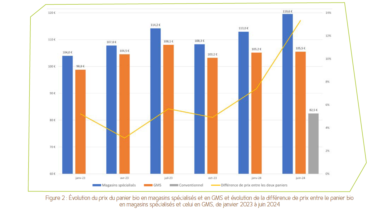 En juin 2025, le panier bio moyen s’élève à 98,3 € en grande surface contre 93,7 € en magasin spécialisé.