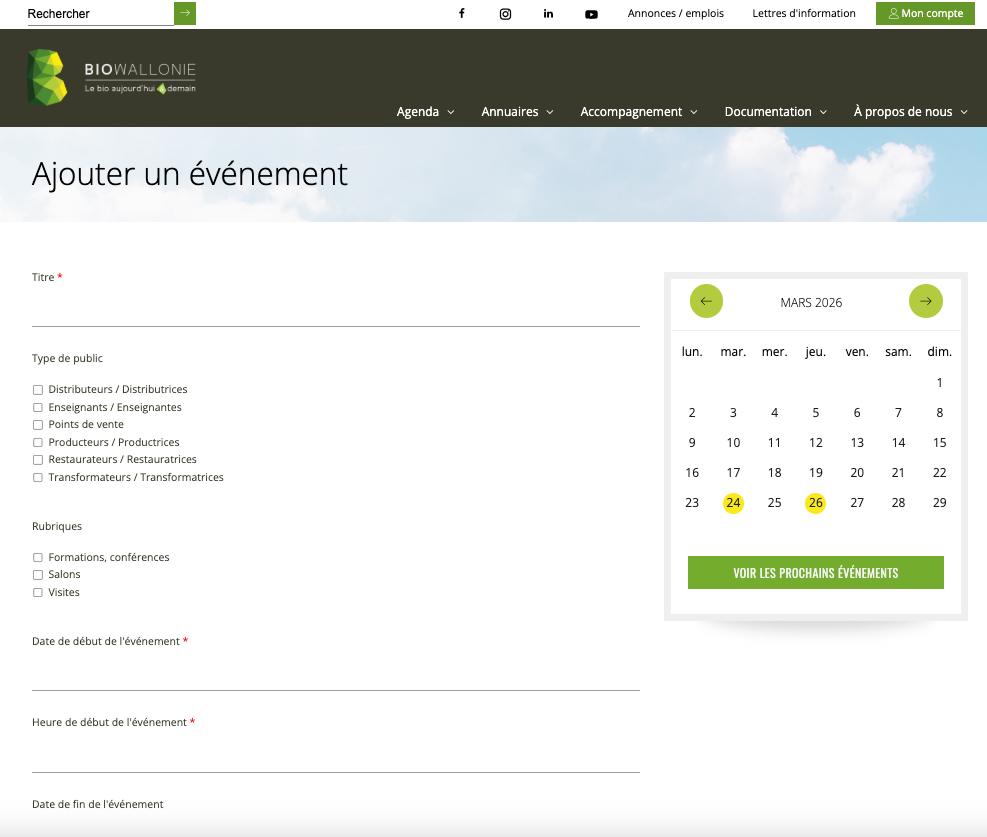 - Après soumission, notre équipe analysera votre demande pour validation. Biowallonie se réserve le droit de ne pas publier un évènement ou une petite annonce dont certaines informations seraient manquantes ou qui ne serait pas en accord avec les valeurs du secteur bio.