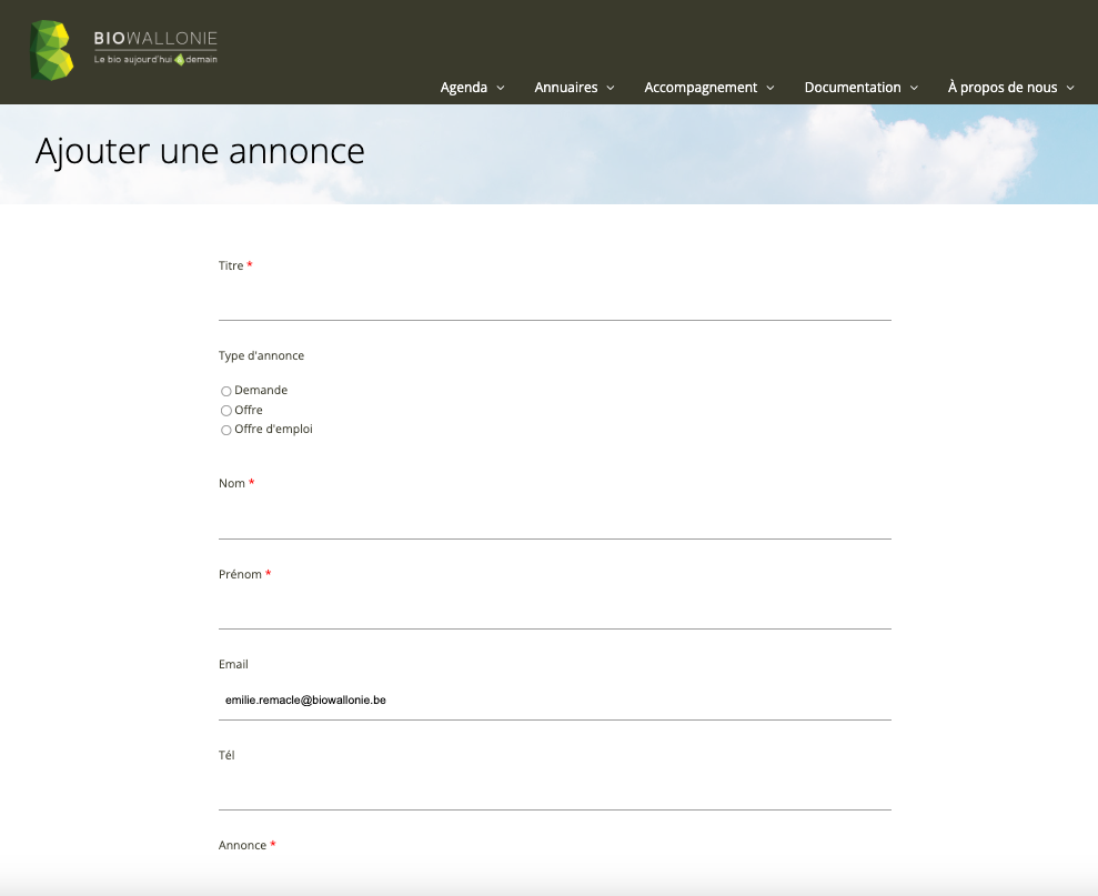 Vous souhaitez diffuser une annonce relative à une offre ou une demande en lien avec votre activité bio (produit, matériel, service, offre d’emploi…) ? Vous organisez un évènement qui pourrait intéresser le secteur bio ? Il est possible de rajouter vous-même votre petite annonce1 ou votre évènement sur le site de Biowallonie ! Nous vous expliquons dans cet article comment y arriver en quelques clics.